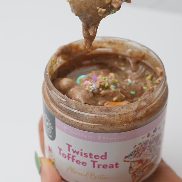 Our small batch, handcrafted Twisted Toffee Treat Almond Butter is 100% gluten-free and gets an extra dose of clean protein from our premium, grass fed, lactose-free whey. Naturally low in sugar, our butter base is sweetened lightly with Stevia. Please refer to our nutritional label for detailed allergen and ingredient information.